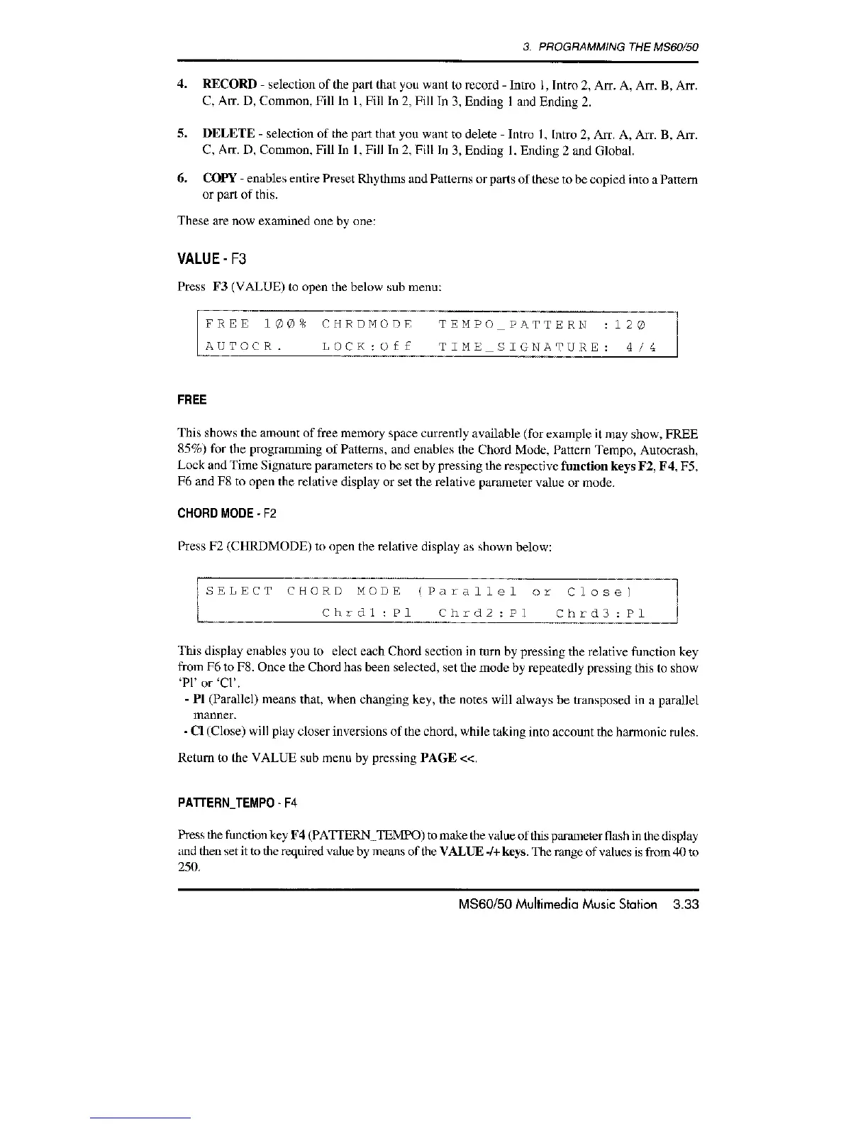 Solton MS60 - EDIT PATTERN - F4; Value Parameter Adjustment; Chord Mode Selection; Pattern Tempo Setting