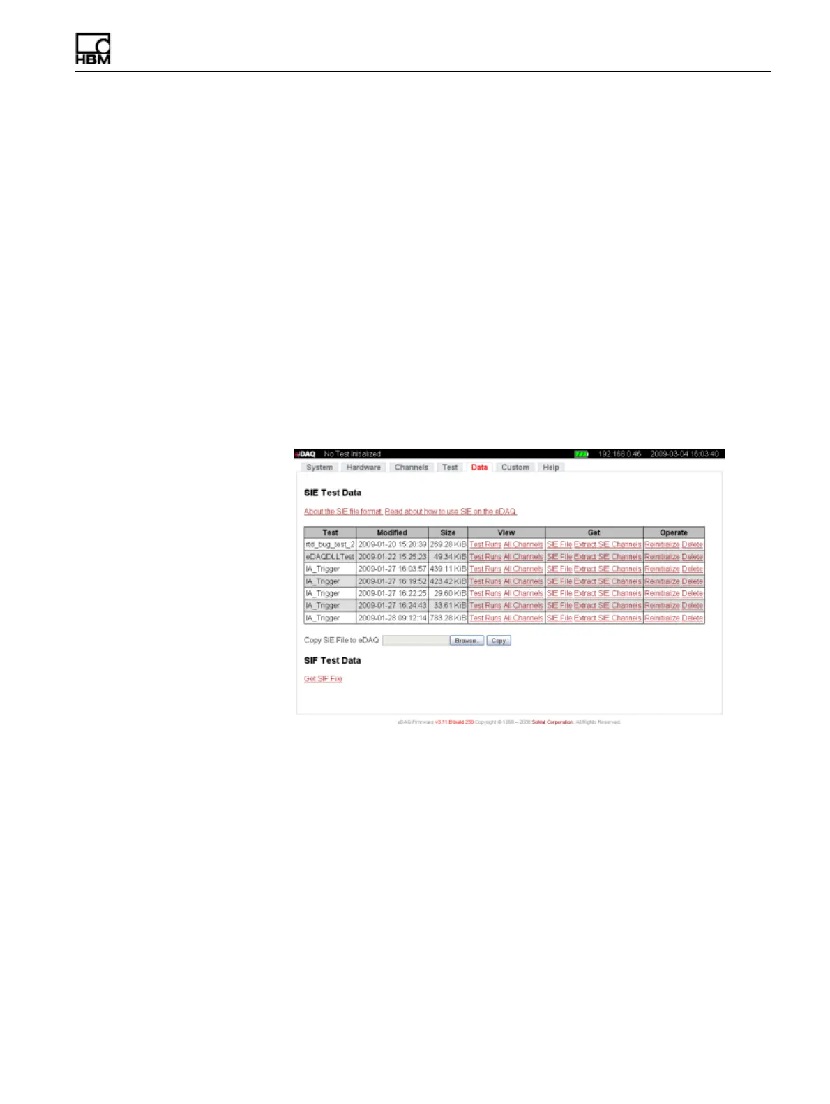 The SIE test data table shows all the SIE data files present on the eDAQ