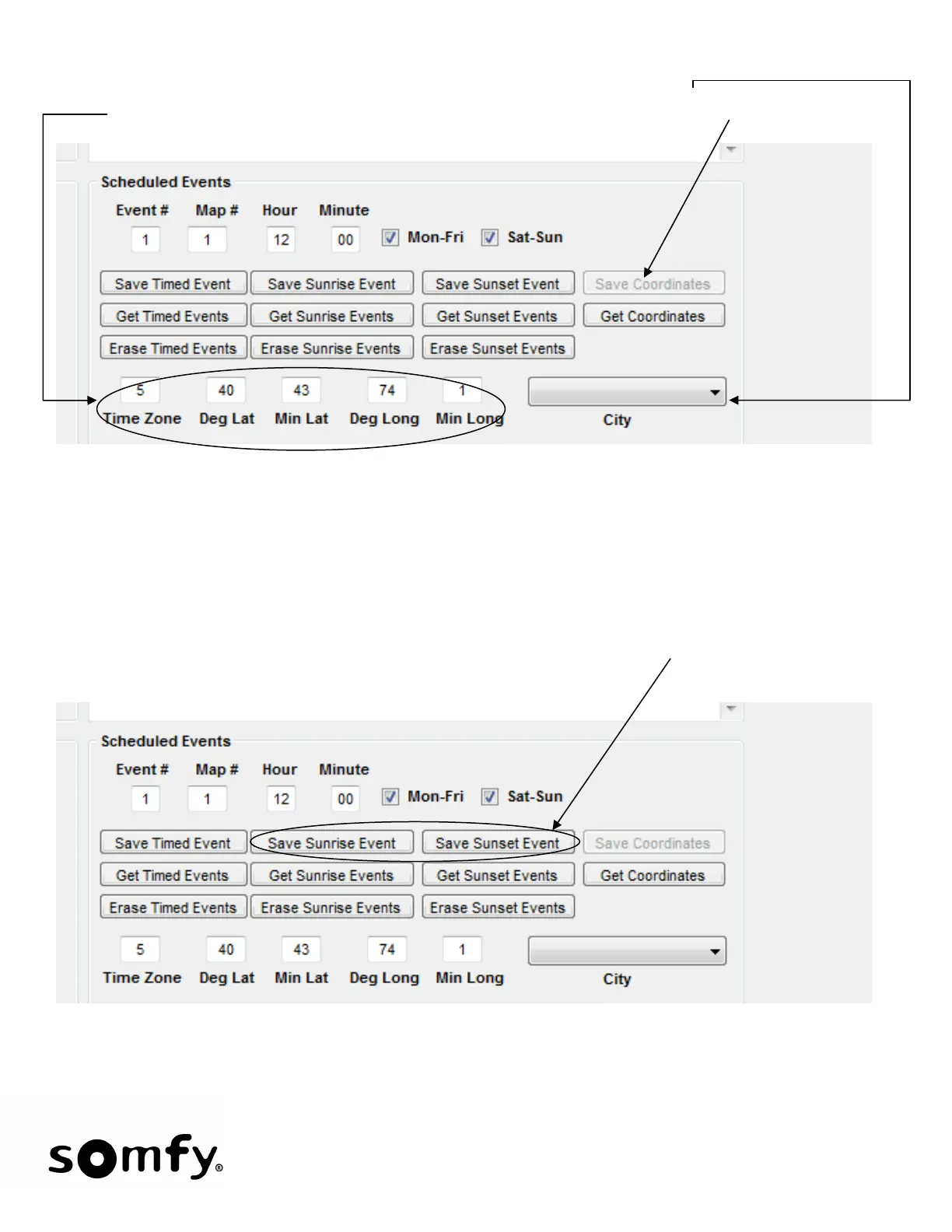 • Sunrise/Sunset Events: The first step is to enter the geographic location of the Somfy Connect. The