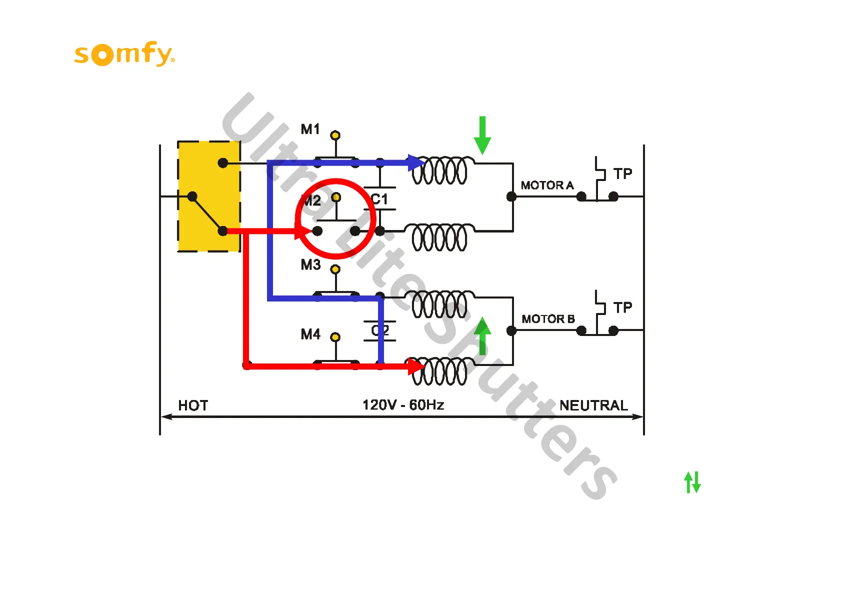 If Motor A reaches its upper limit before Motor B micro-switch M2 opens and the down direction