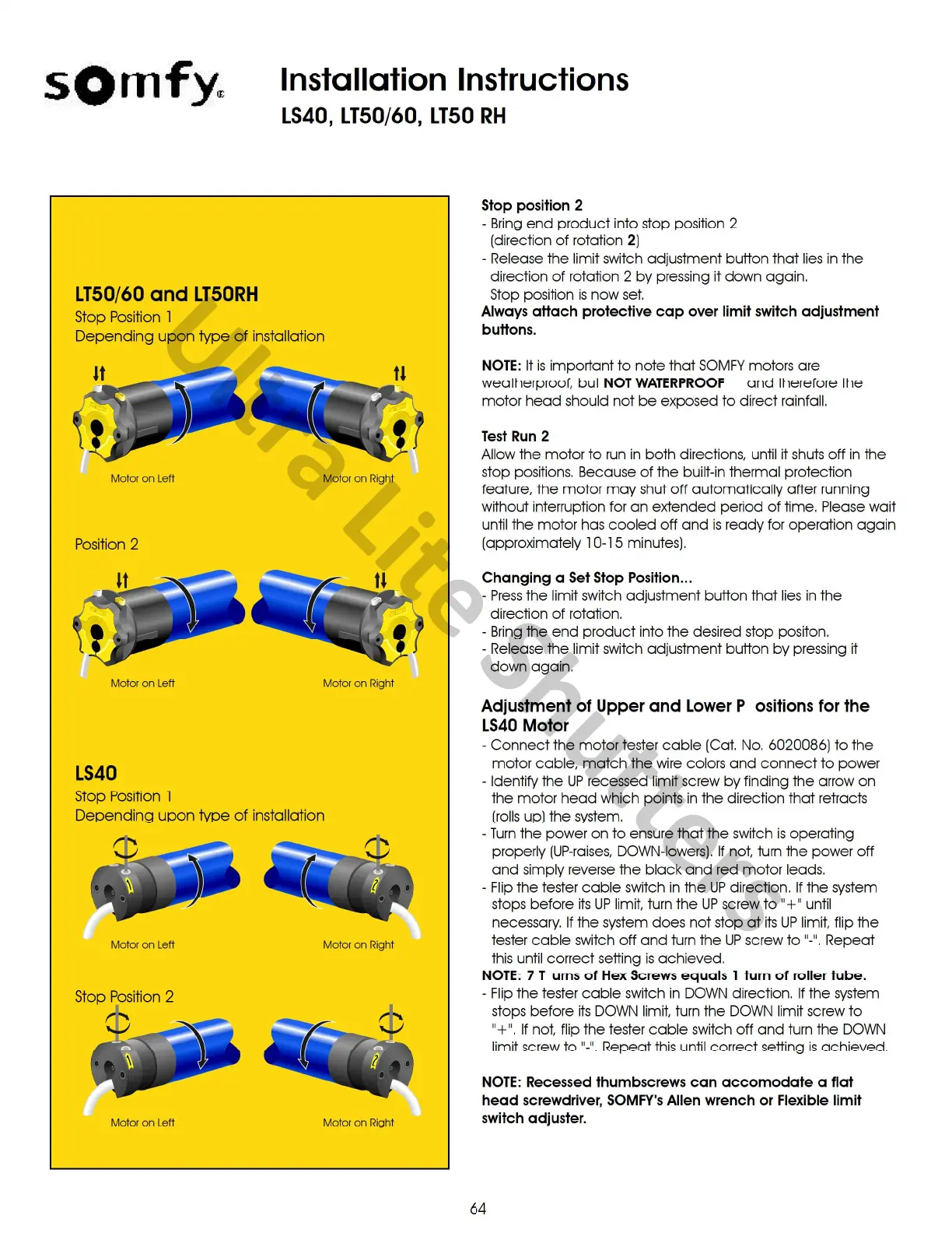 SOMFY LT60 - Motor Installation Instructions; Setting Stop Positions; Test Run and Limit Adjustment