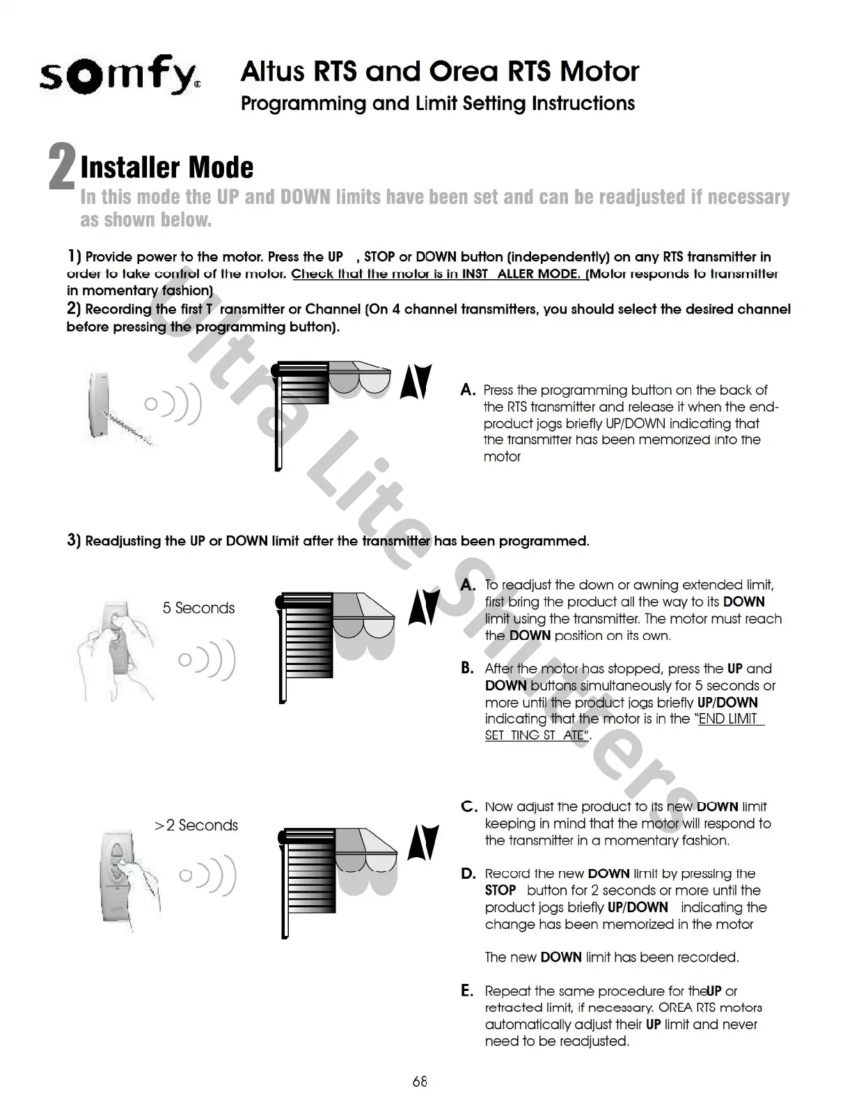 SOMFY LT60 - RTS Motor Programming: Installer Mode; Recording First Transmitter (Installer Mode); Readjusting Motor Limits (Installer Mode)