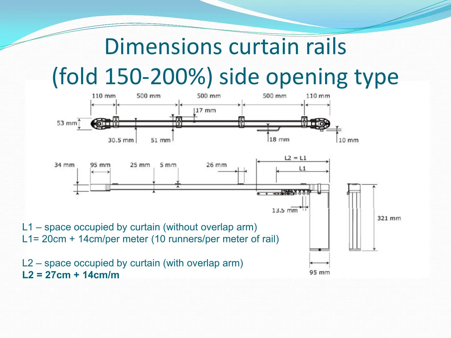 L1= 20cm + 14cm/per meter (10 runners/per meter of rail)