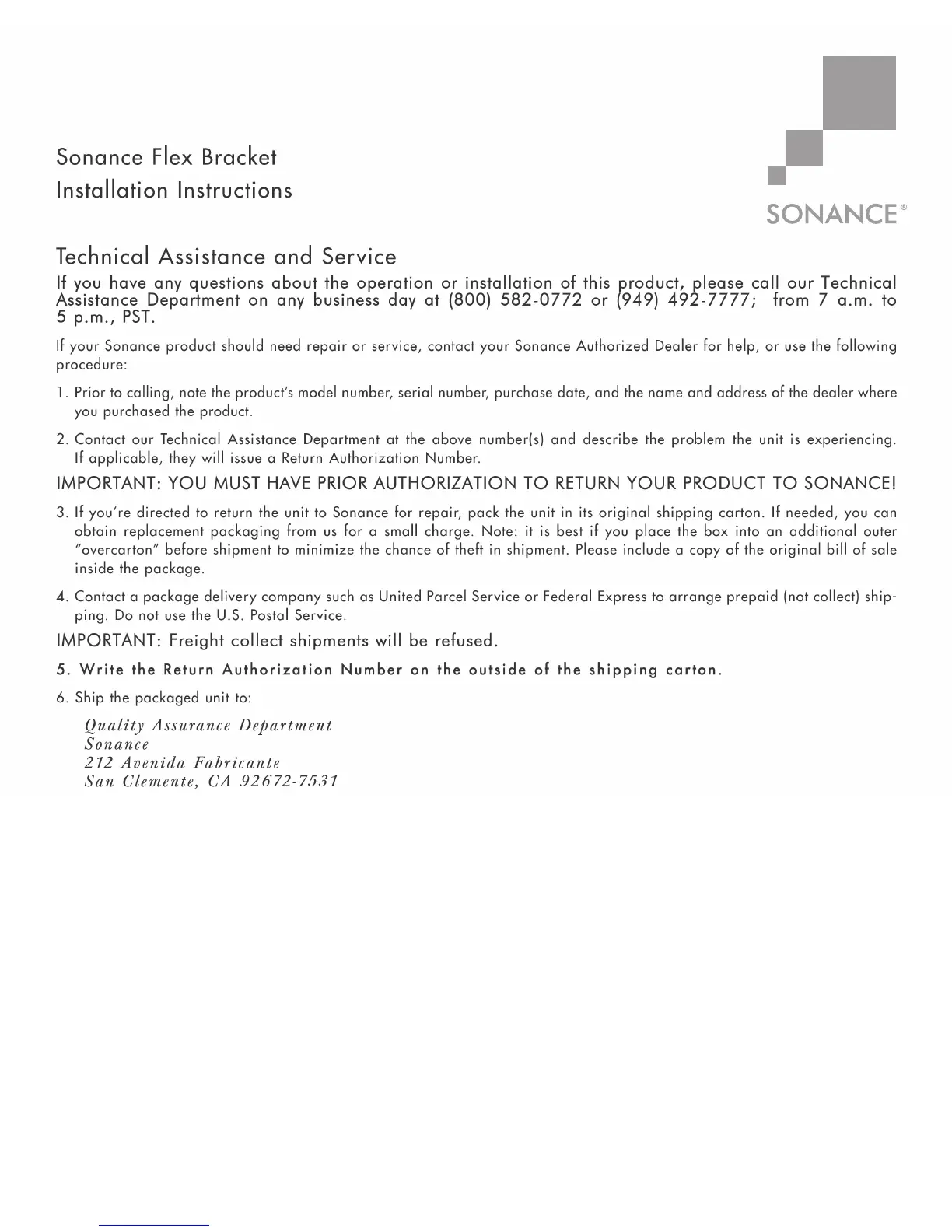 Sonance Flex Bracket - Technical Assistance and Service; Contacting Support; Product Return Procedure