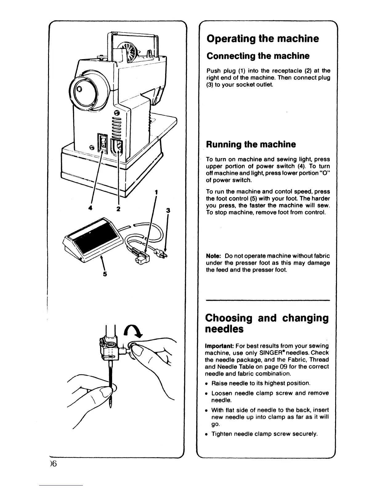Sonata 6610 - Operating the Machine; Choosing and Changing Needles; Connecting the Machine; Running the Machine