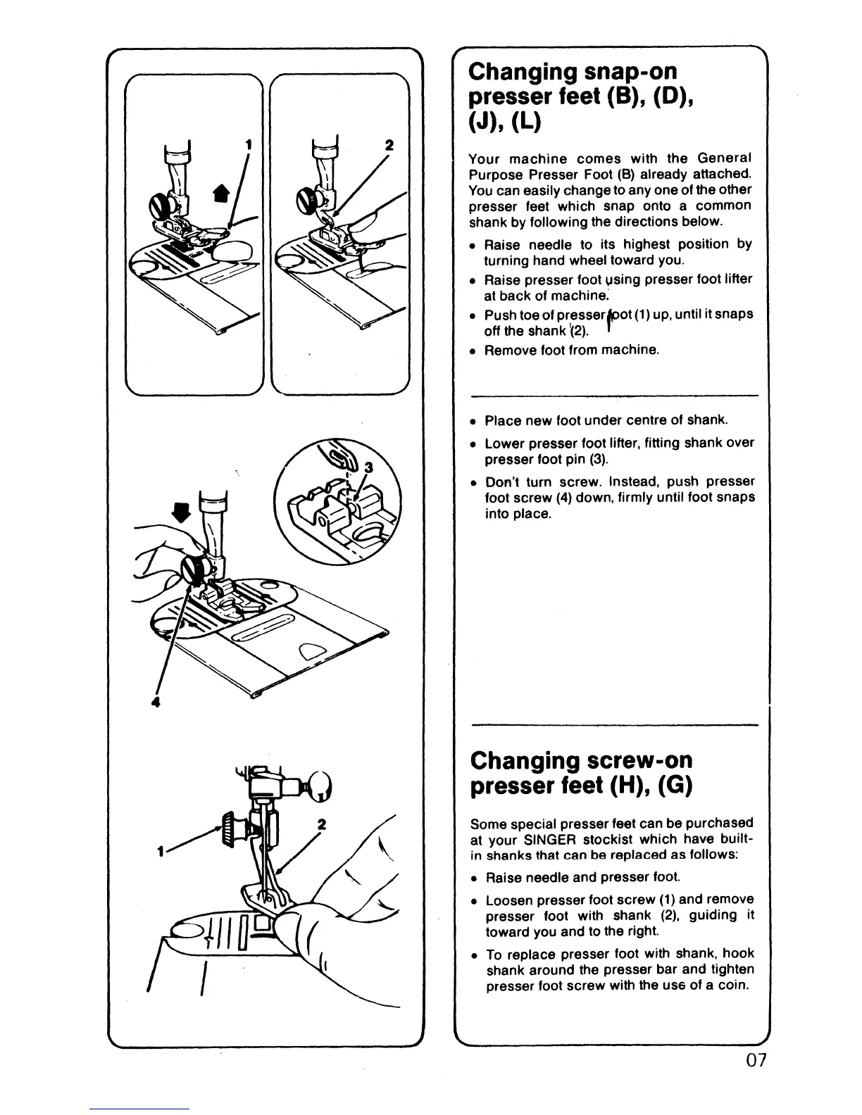 Sonata 6610 - Changing Snap-On Presser Feet; Changing Screw-On Presser Feet