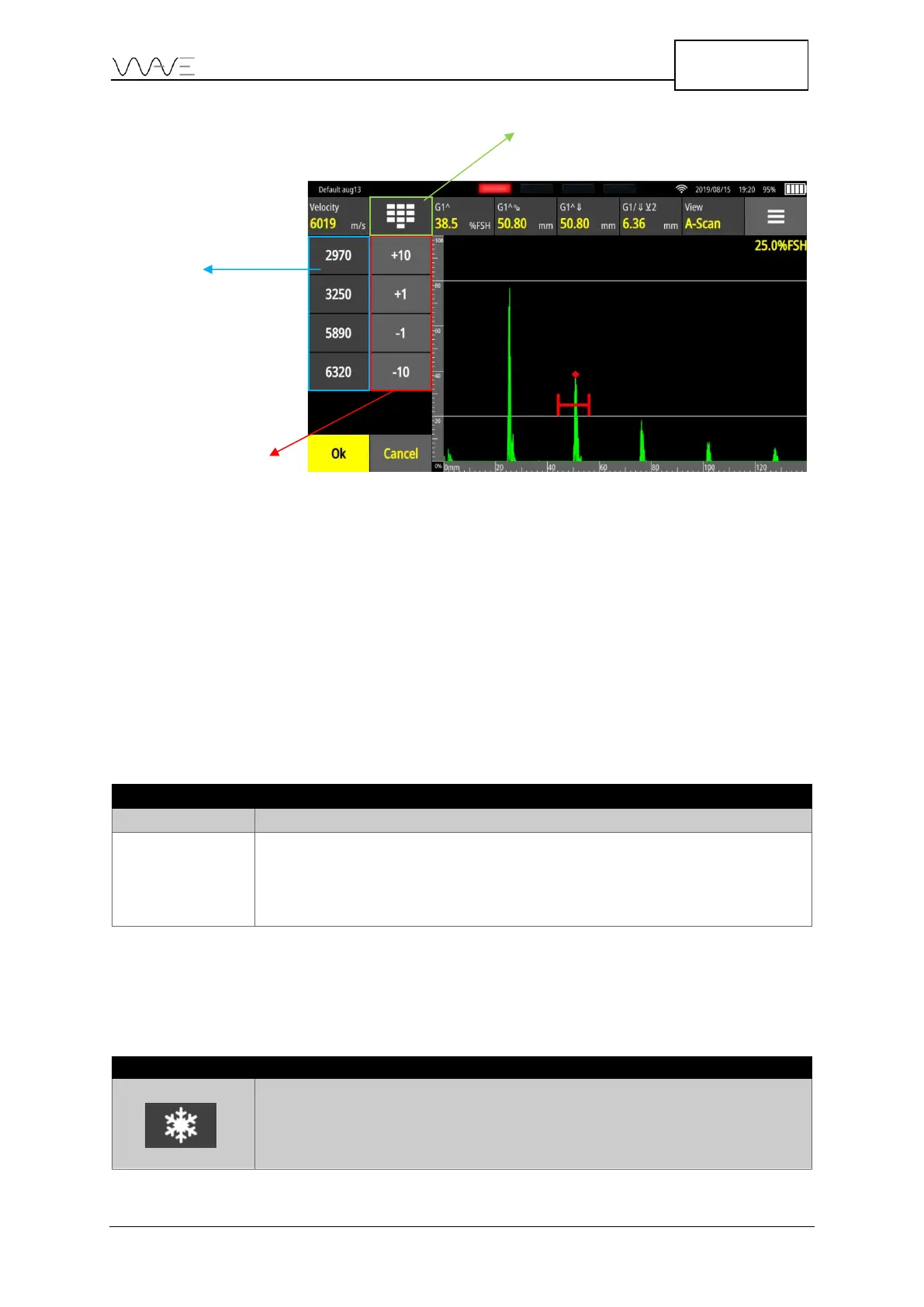 Freezes the A-Scan. Once frozen, all gates remain active and can be moved