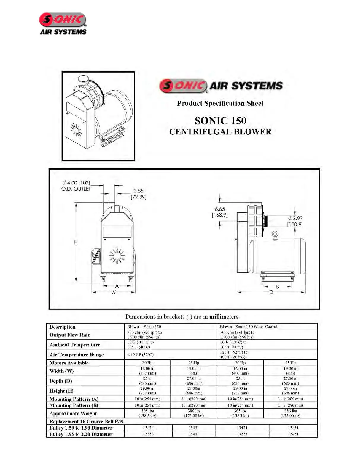 Sonic Air Systems Sonic 150 - Blower Specifications; Sonic 150 Specification Sheet