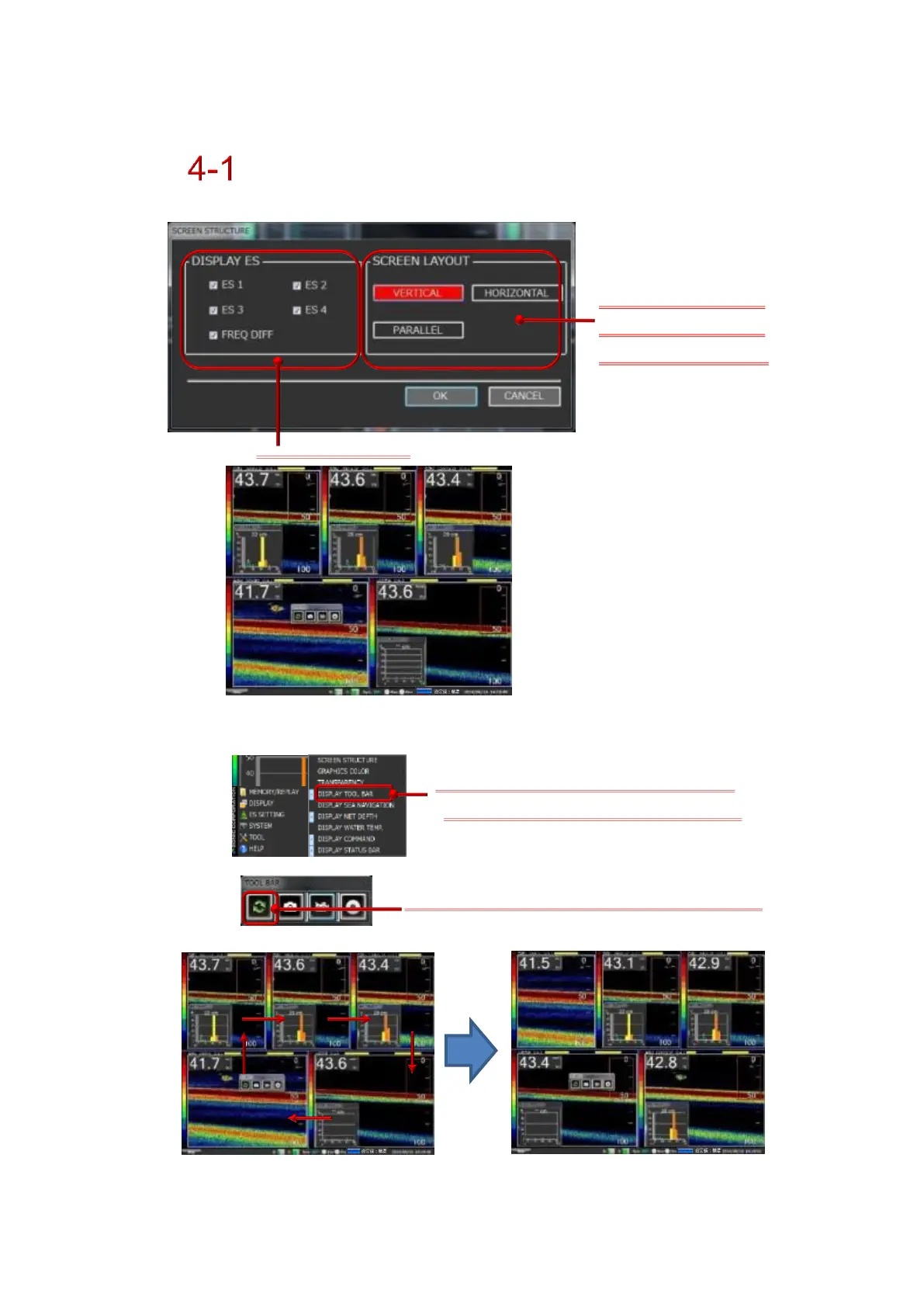 When selecting a 5-window screen structure (Four transducers must be