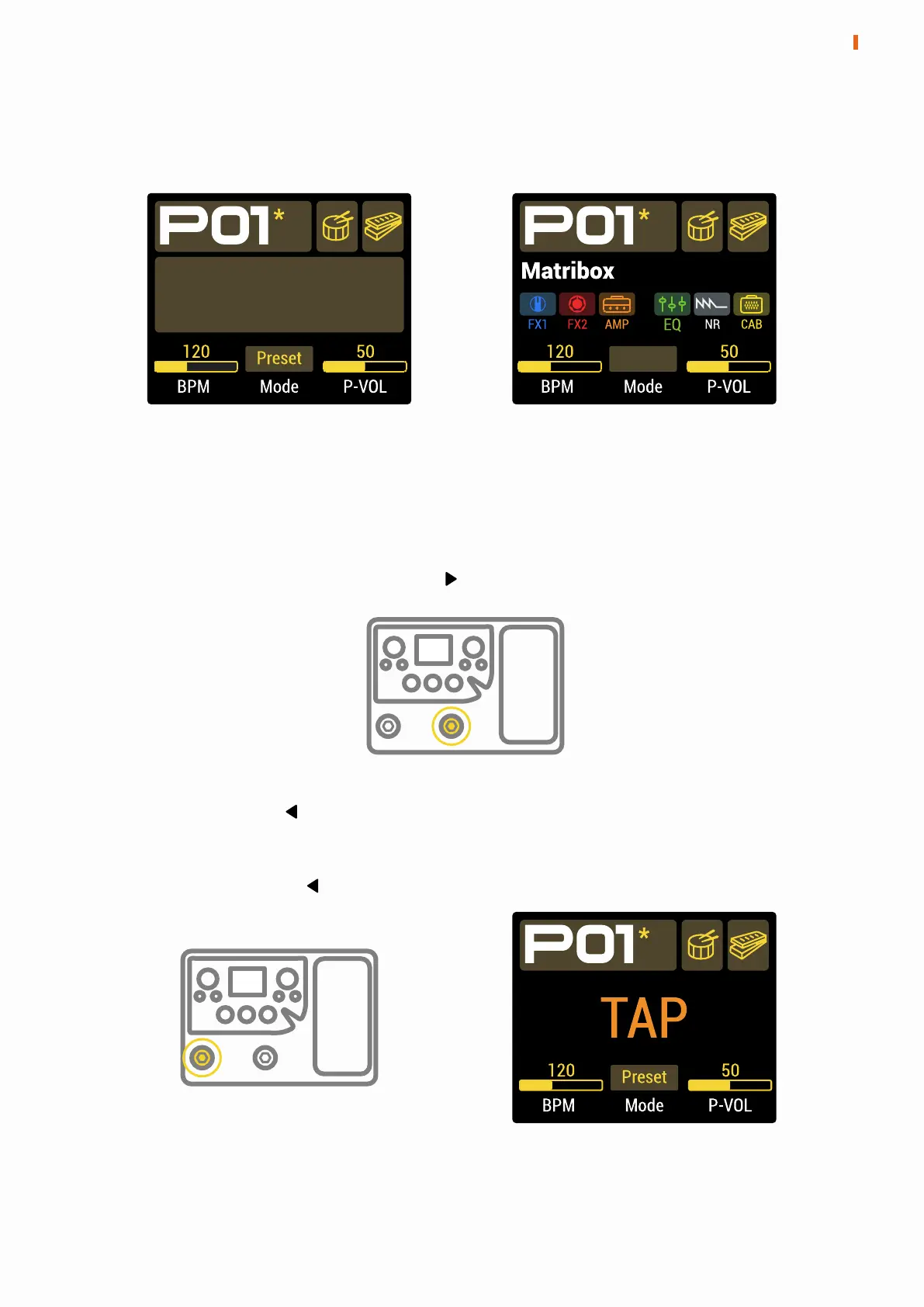 Tempo. The Tap Tempo function enables the footswitches to set preset BPM