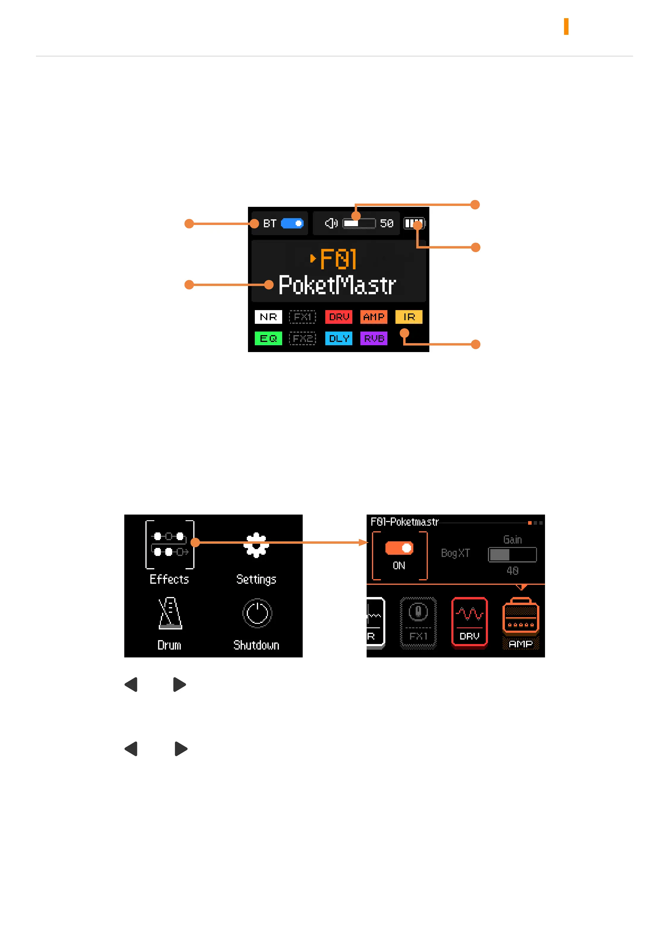 Press “ ” / “ ” to switch presets, switch effect modules and various