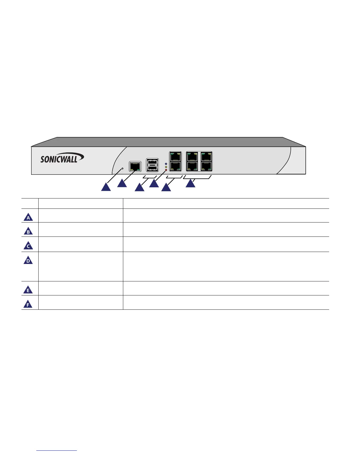 Console Port Used to access the SonicOS Command Line Interface (CLI) via the DB9 -> RJ45 cable.