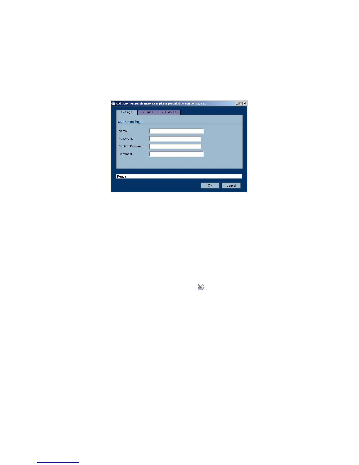 To add an individual user to the SonicWALL security appliance’s local user database for VPN access: