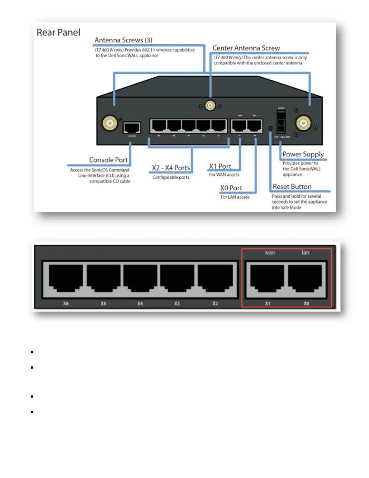 Locate the SonicWall ports X0 and X1, port X0 is also label as LAN and port X1 is also label as WAN.
