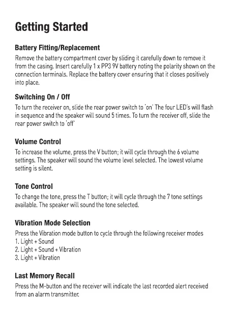 Sonik SKS - Getting Started with SKS Receiver; Receiver Battery Fitting and Replacement; Switching the SKS Receiver On and Off; Adjusting Receiver Volume