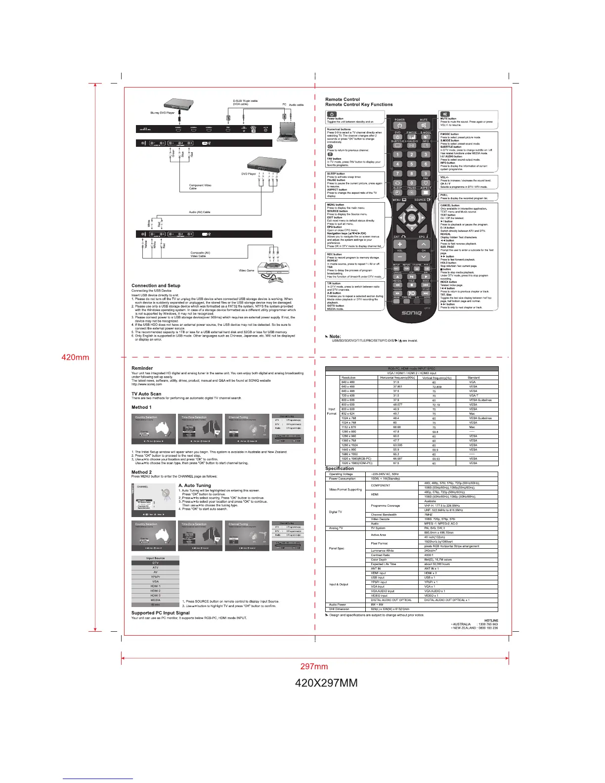 SONIQ E40V14A-Au - Remote Control Functions; Key Function Descriptions; Connectivity and Setup; USB Device Connection