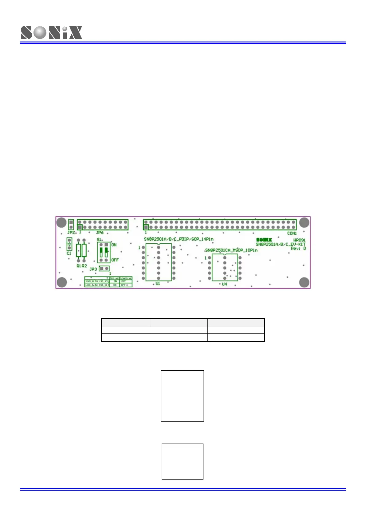 U1: SN8P2501D/2501A/B/C chip 14-pin packages connector for connecting to user’s target board.