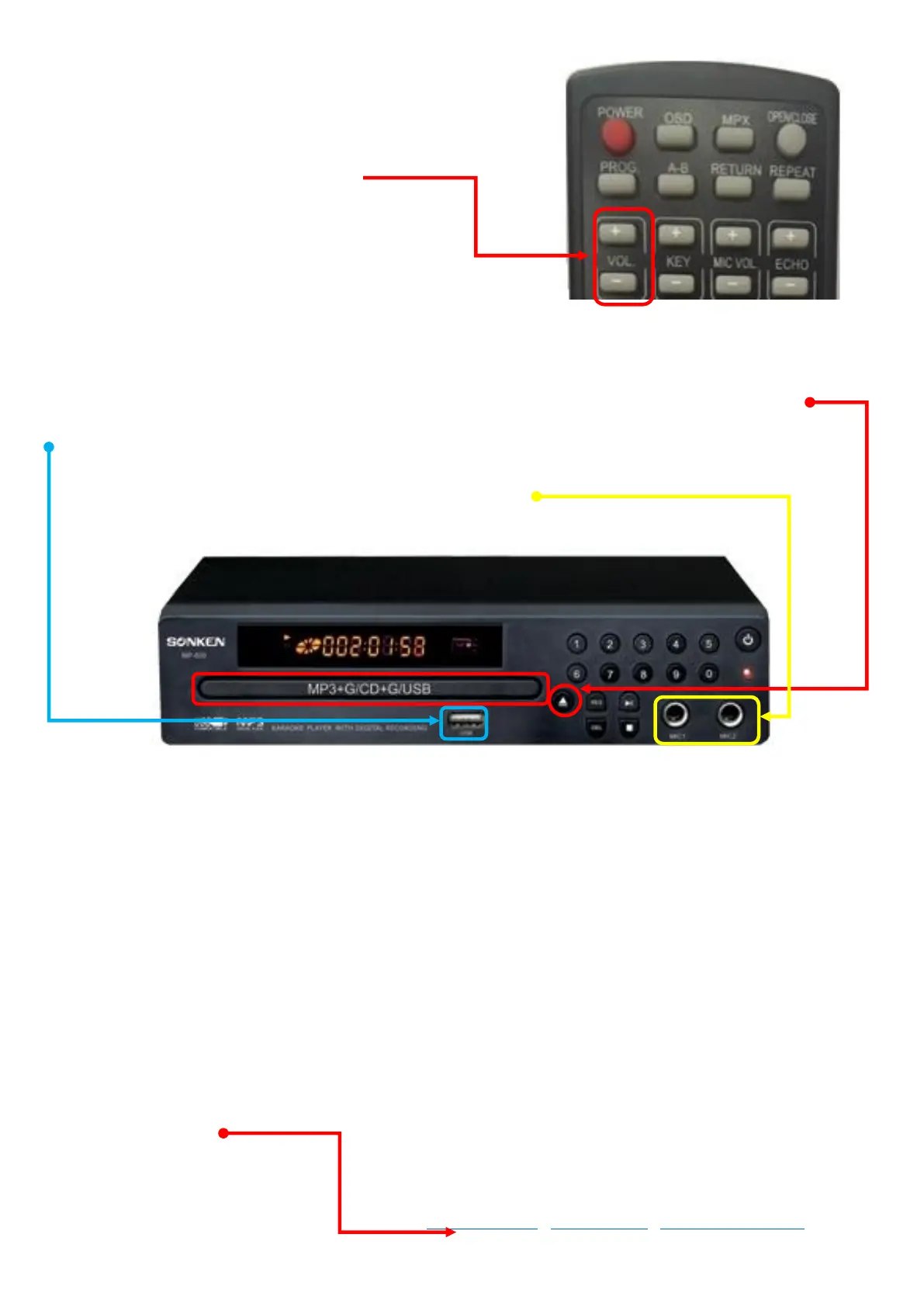 Or you can insert an 8GB USB Stick with MP3+G karaoke files on it into the USB port, once the menu shows up, use