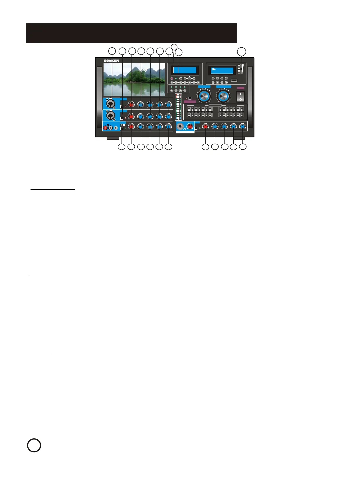 13.MICROPHONE INPUT jacks- 1/4 inch inputs for microphones.