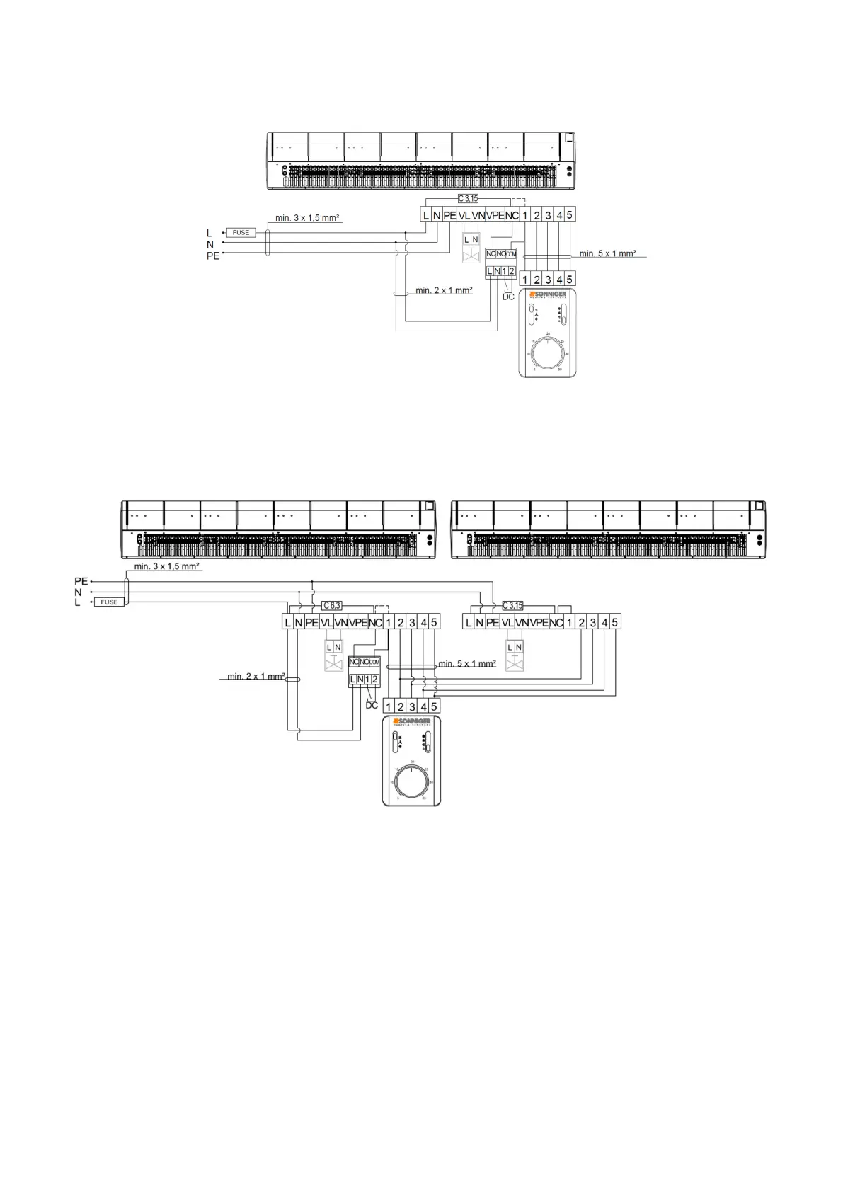8.2. Schéma připojení dvou clon GUARD 100-150-200 W (vodní ohřívač) a C (bez ohřevu) k jednomu panelu