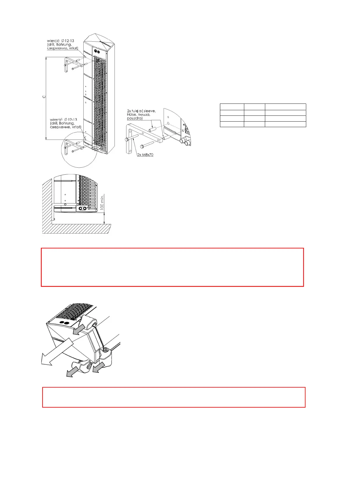 Minimalna odległość urządzenia od podłogi nie może być mniejsza niż 100 mm.