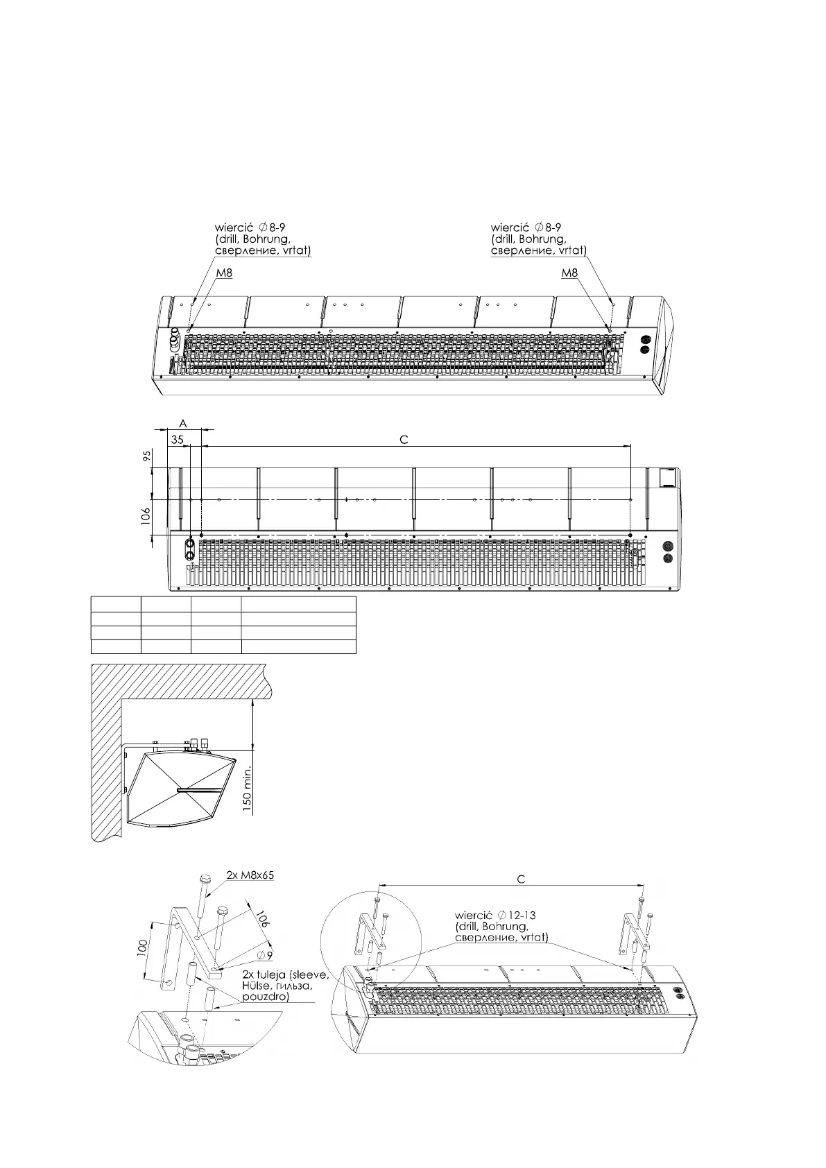 Die Montage unter der Decke erfolgt mit 4 Gewindebolzen M8. Um das Gerät an den Gewindebolzen aufzuhängen, bohren Sie