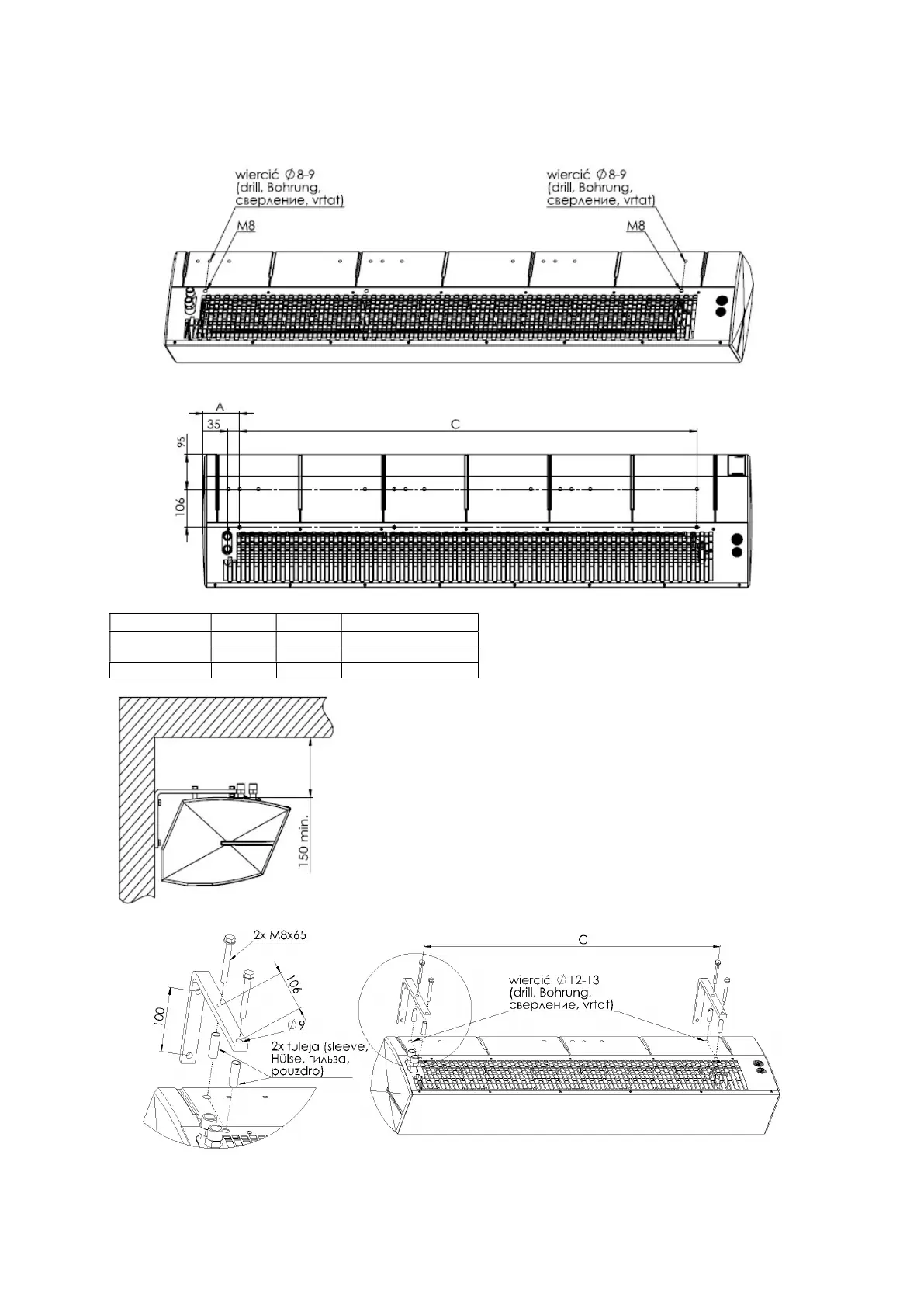 L'installation sous plafond se fait à l'aide de 4 broches M8. Pour accrocher l'appareil sur les broches, percez des trous Ø 8-9mm
