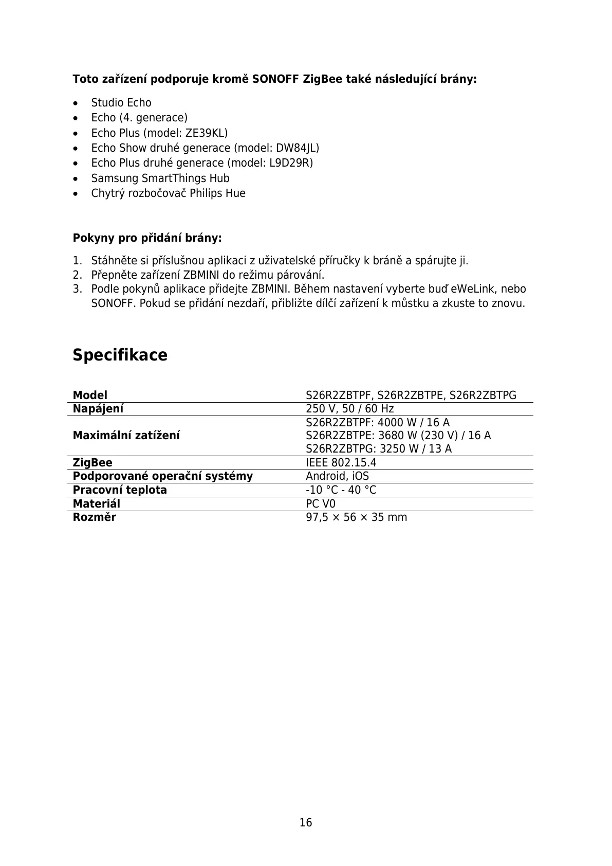 Toto zařízení podporuje kromě SONOFF ZigBee také následující brány: