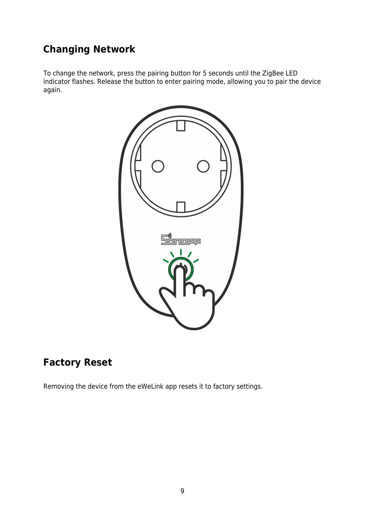 To change the network, press the pairing button for 5 seconds until the ZigBee LED
