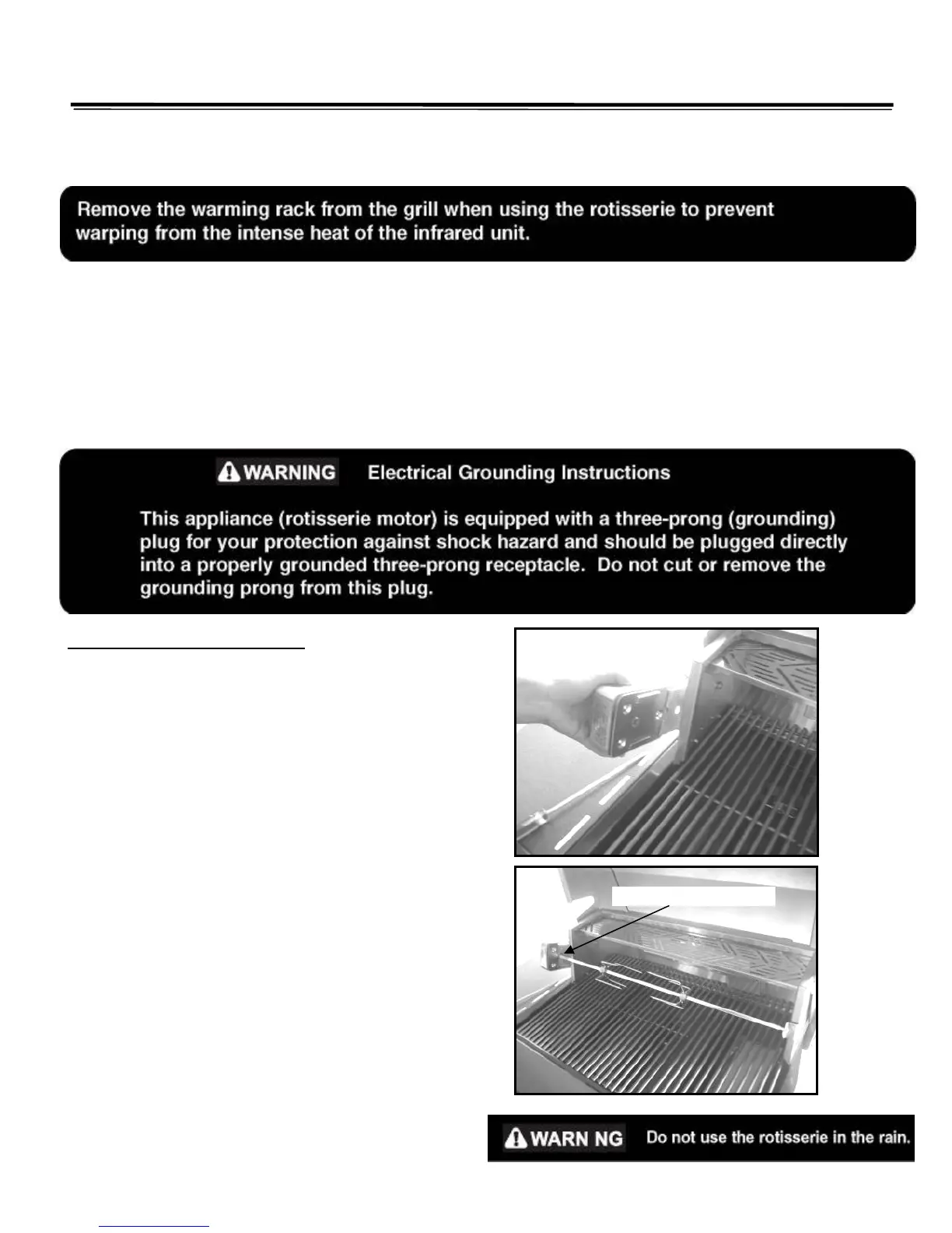 the grill. Make sure the rotisserie motor is completely seated on the bracket prior to operating. Make sure the rotisserie