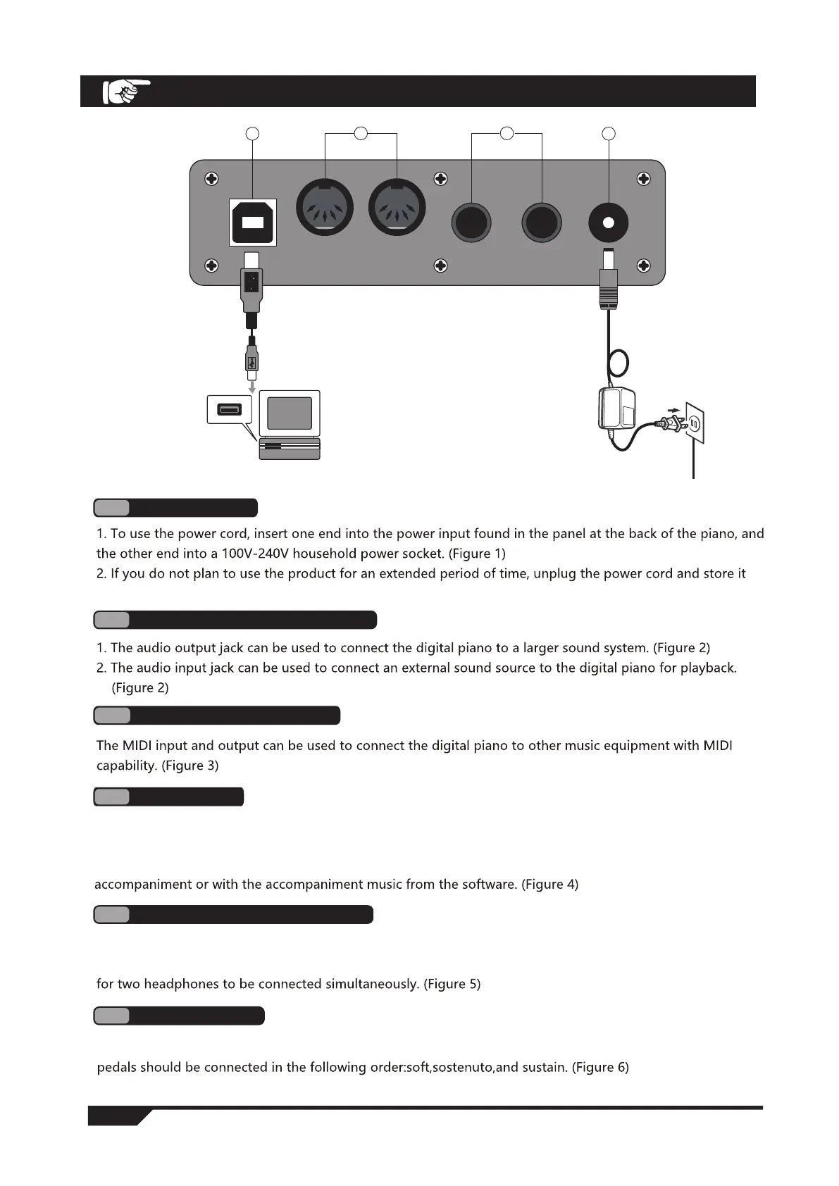 To connect the triple-pedal, insert the pedal plug into the indput located at the back of the piano. The