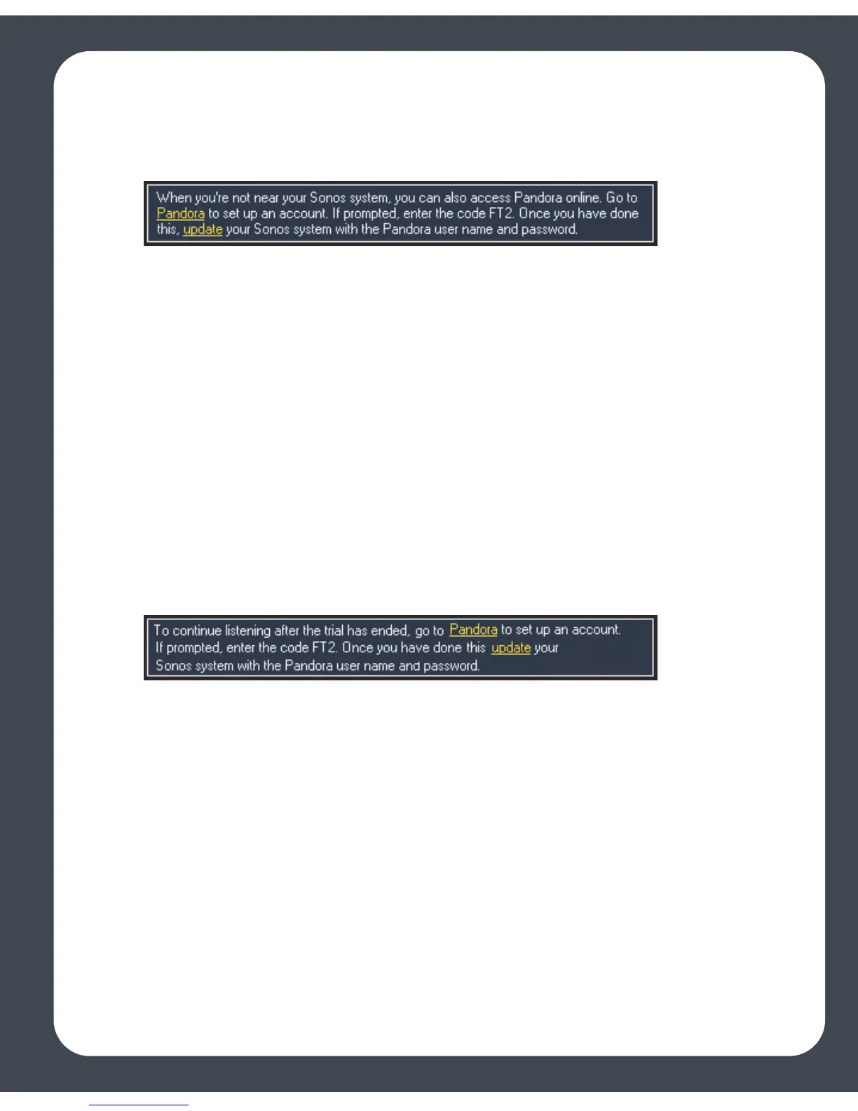 trial (in the example above, the code is FT2.) If you enter this code during the Pandora