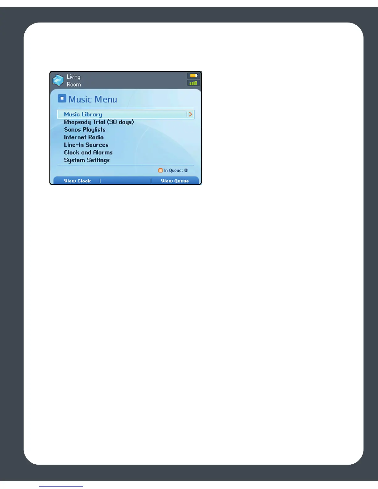 7. Press the Music button to display the Music menu.