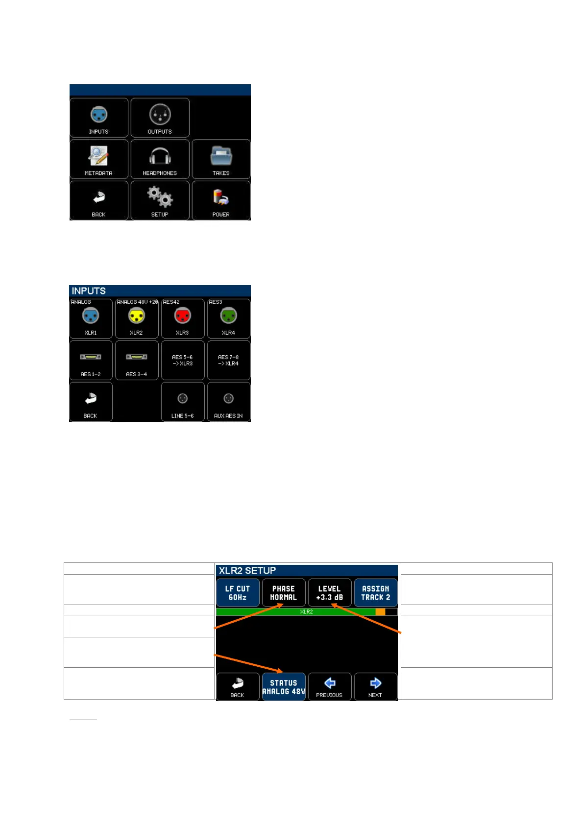 Pressing on a XLR icon calls the corresponding [XLR SETUP] page, showing the current configuration and settings.