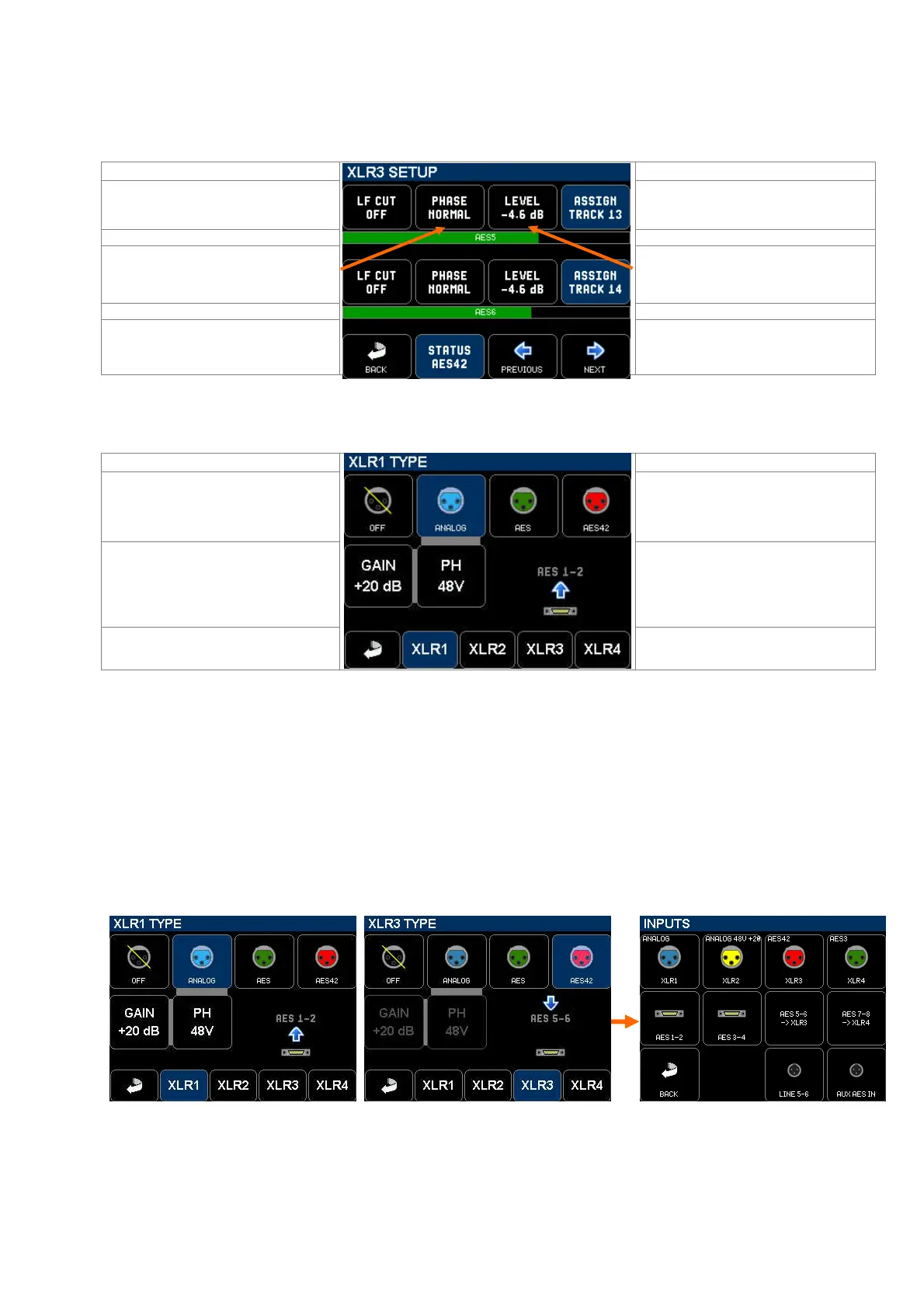 XLR1 configured as Analogue input XLR3 configured as AE42 input INPUT menu showing that