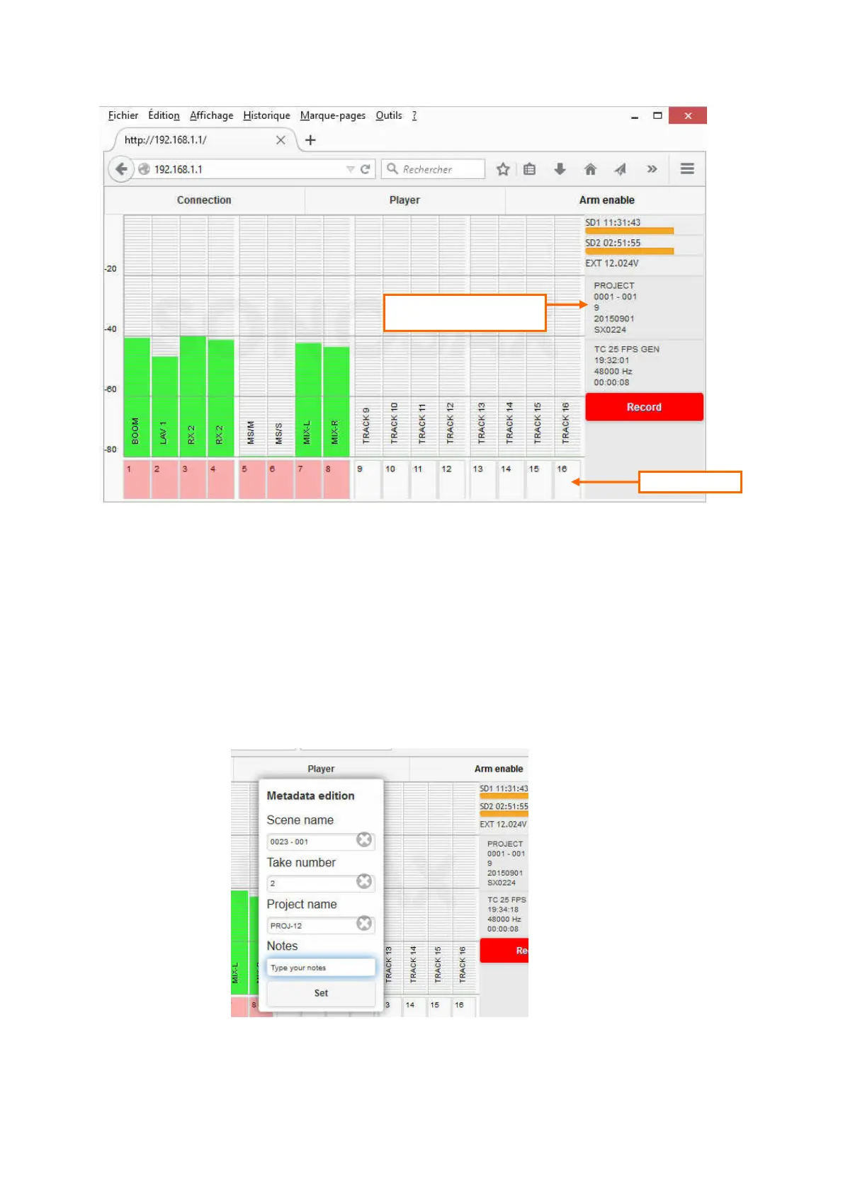 • Arm enable: Enable / disable the track arming keys at the bottom of the page. The tab turns red when the