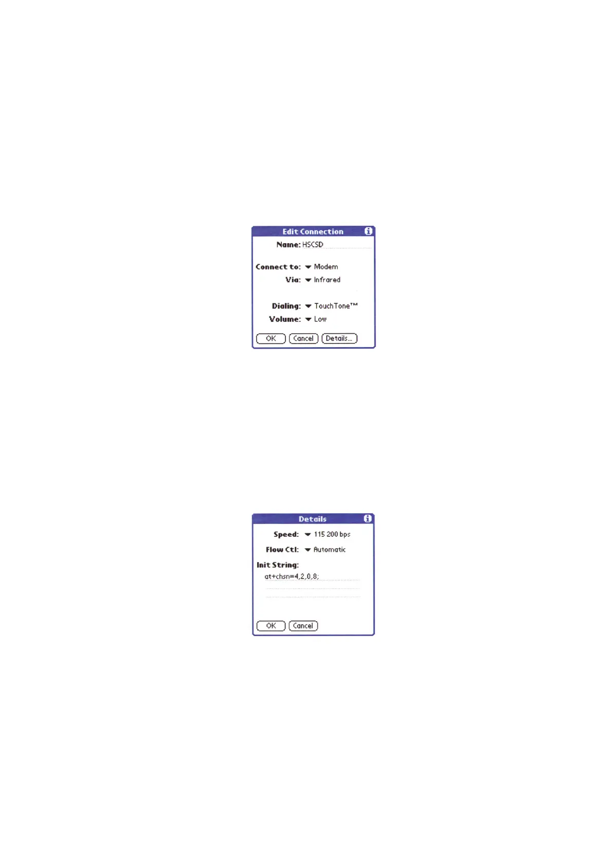 •Palm™ V: Connection method:IrCOMM to Modem (if you intend to use infrared).