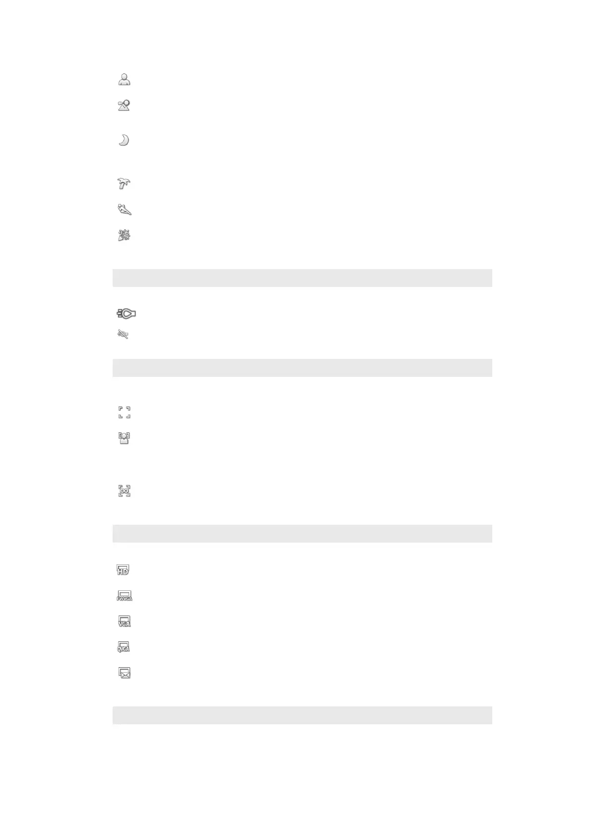 Use for videos of landscapes. The camera focuses on distant objects. When Landscape is selected,