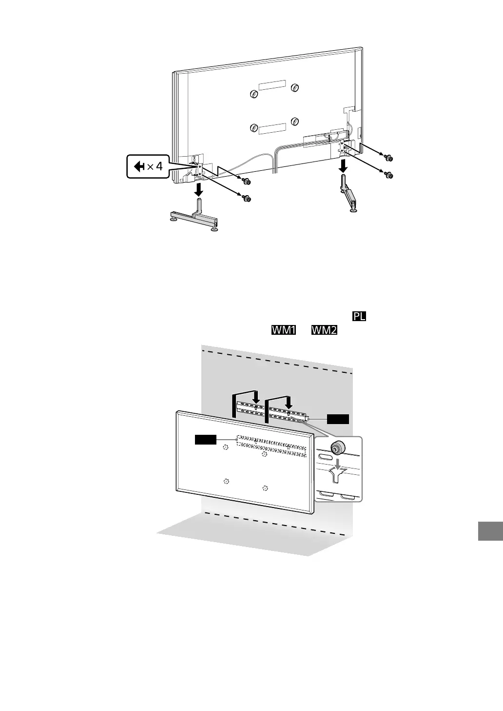 •Jos kiinnität pöytäjalustan takaisin paikalleen, muista kiinnittää ruuvit (jotka irrotettiin aiemmin) television takana oleviin