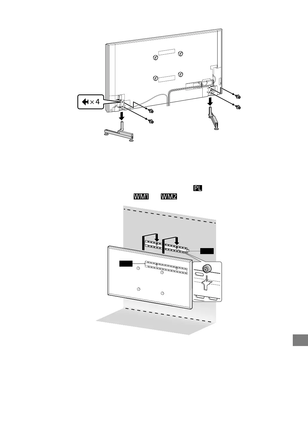 •Når du fester bordstativet igjen, sørg for å feste skruene (fjernet tidligere) i de opprinnelige hullene på baksiden av TV-en.