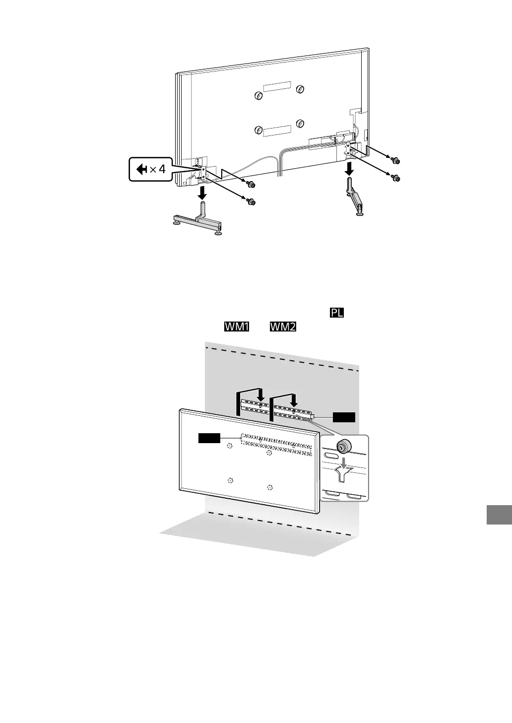 •Når TV-foden monteres igen, fastgøres skruerne (der blev fjernet tidligere) i de oprindelige huller på bagsiden af TV'et.