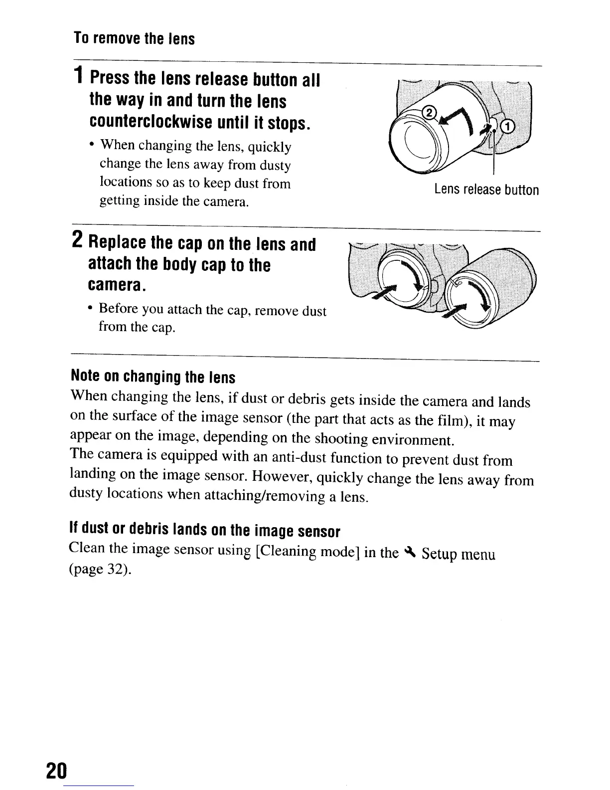 • When changing the lens, quickly