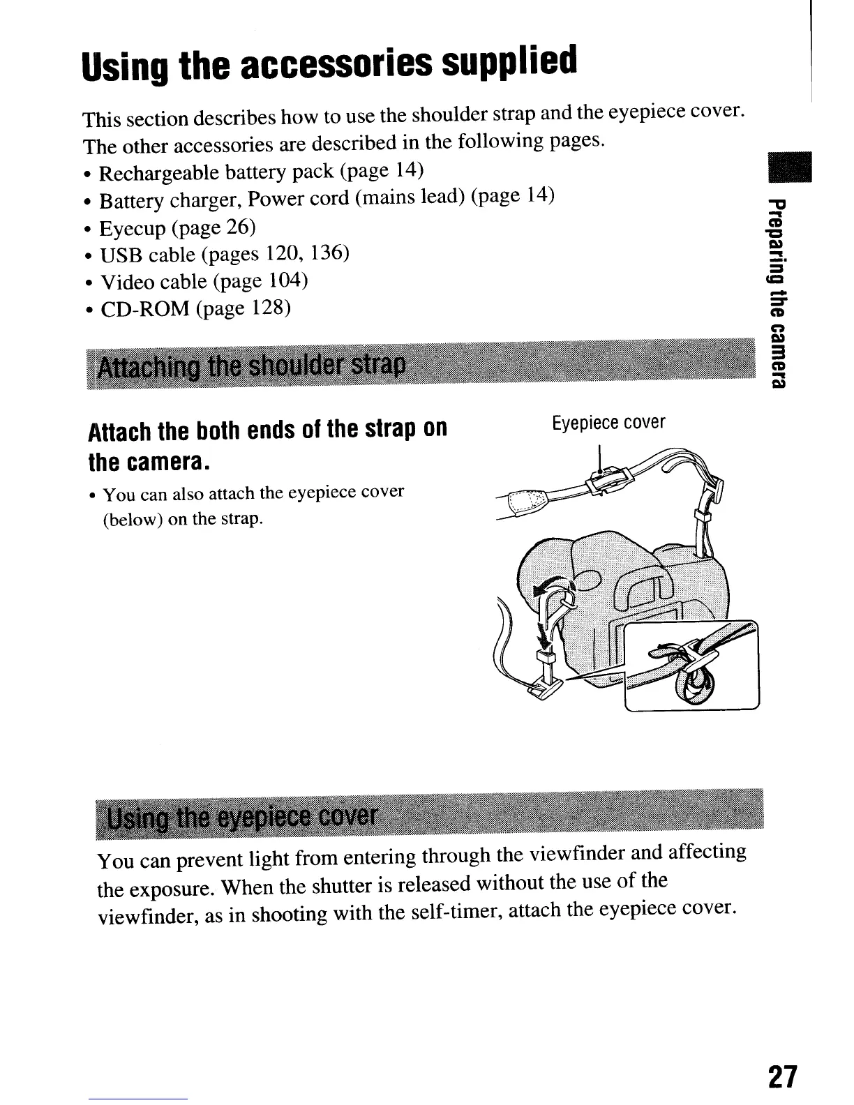 This section describes how to use the shoulder strap and the eyepiece cover.