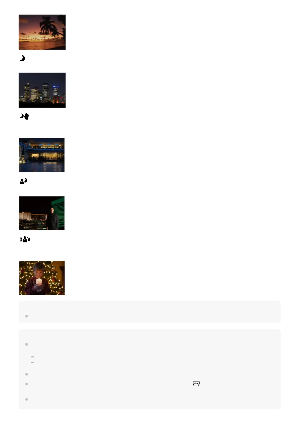 Shoots night scenes with less noise and blur without using a tripod. A burst of shots are taken, and image processing is