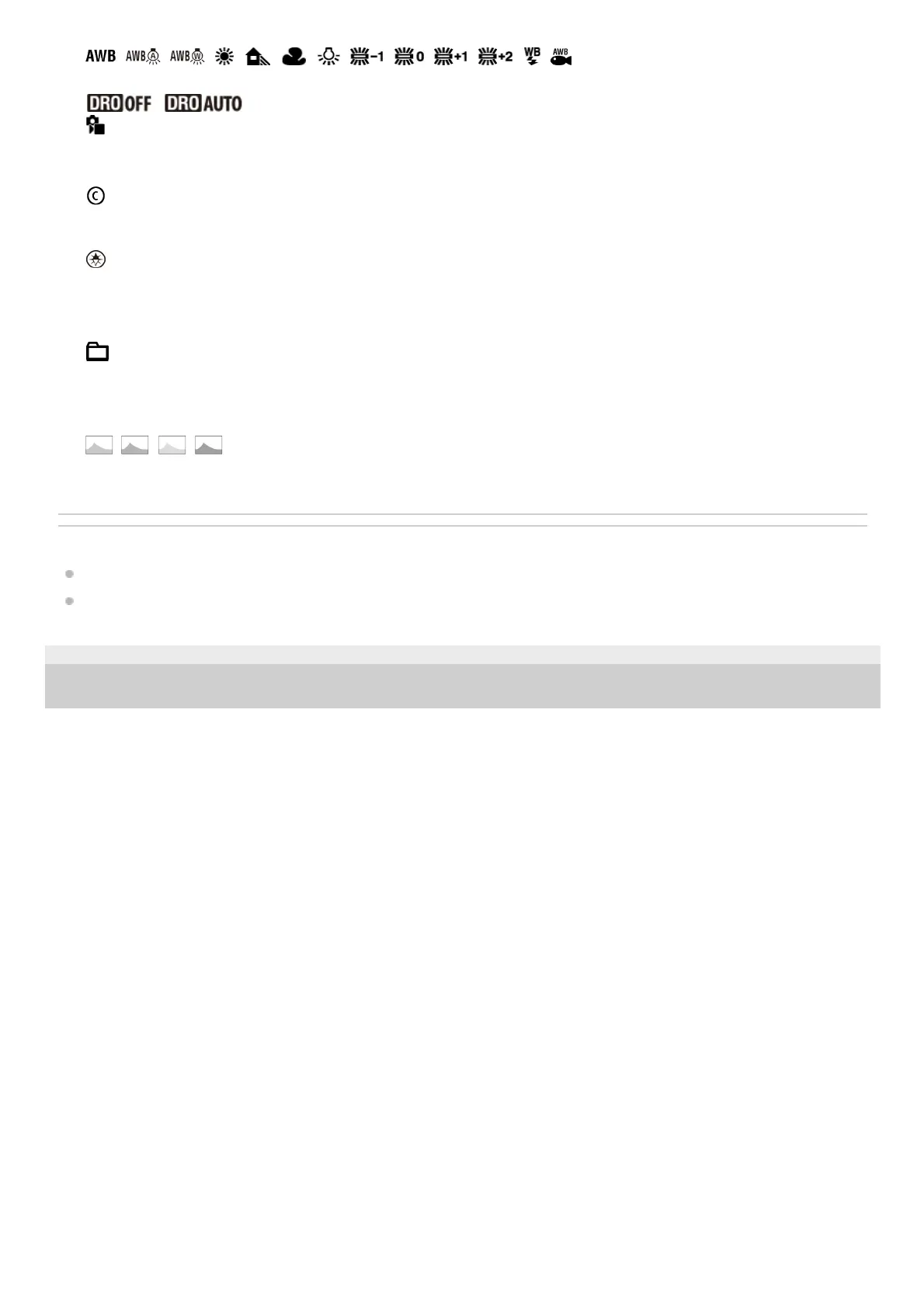 List of icons on the screen for shooting still images