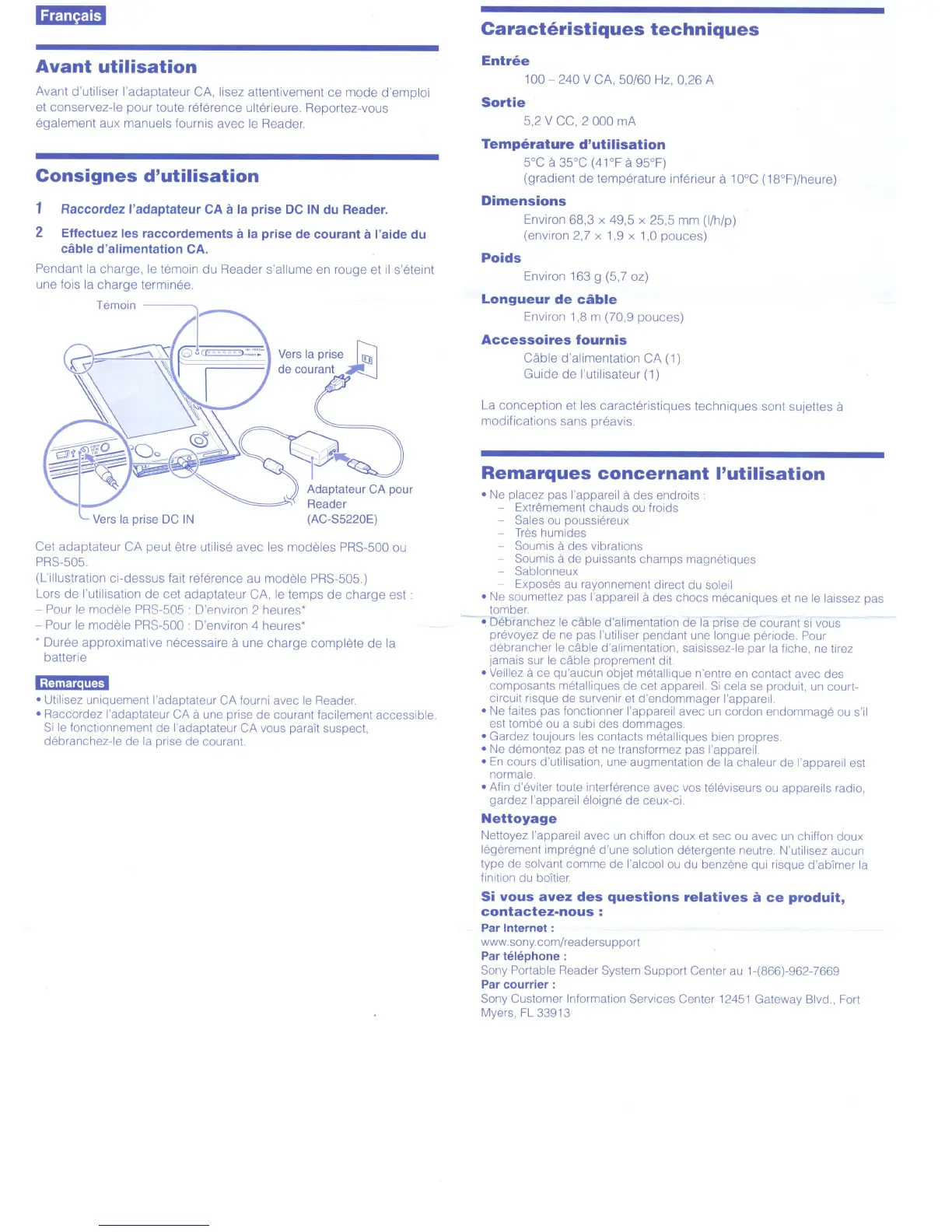 Cet adaptateur CA peut etre utilise avec les modeles PRS-500 ou