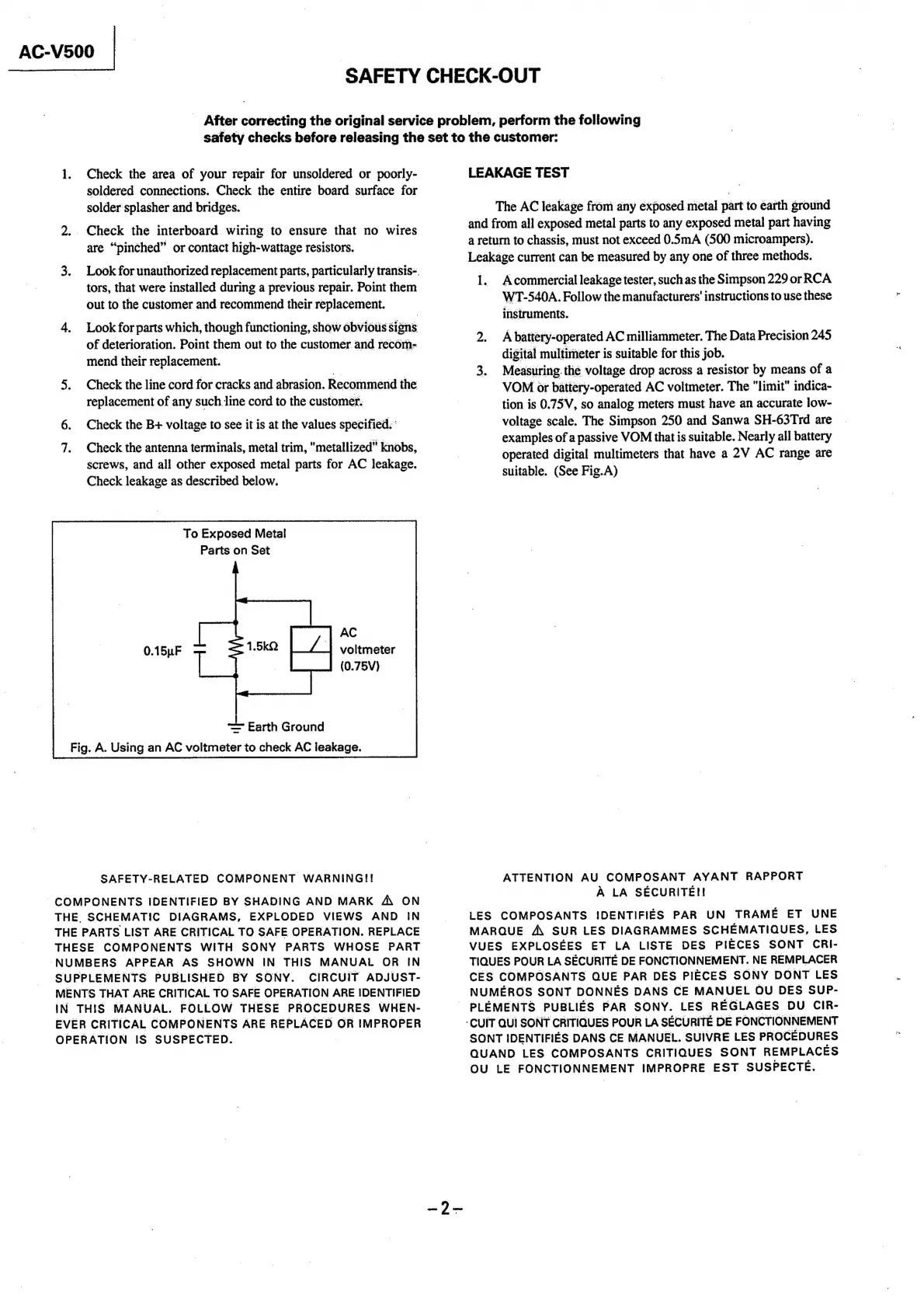 Sony AC-V500 - SAFETY CHECK-OUT; LEAKAGE TEST