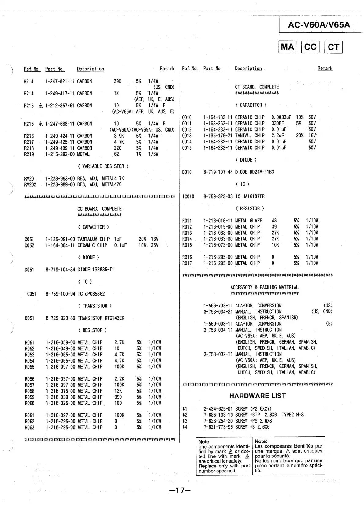 Sony AC-V60A - Hardware List