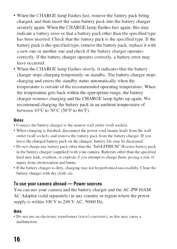 • When the CHARGE lamp flashes fast, remove the battery pack being