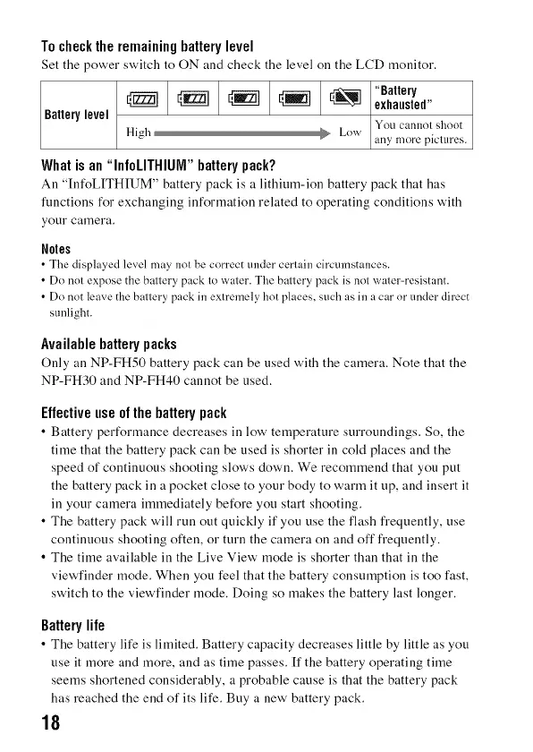 Only an NP-FH50 battery pack can be used with the camera. Note that the